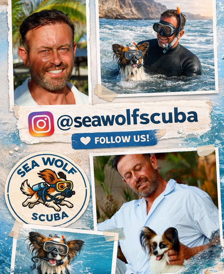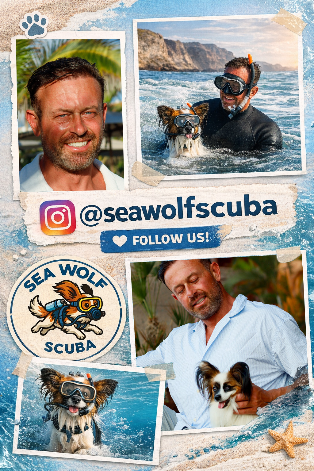 Sea Wolf Scuba is a small, personal operation — slower pacing, tiny groups, and a strong focus on safety and comfort. I’m usually joined by Lobo, the little “sea wolf” who inspired our logo and supervises the surface intervals.